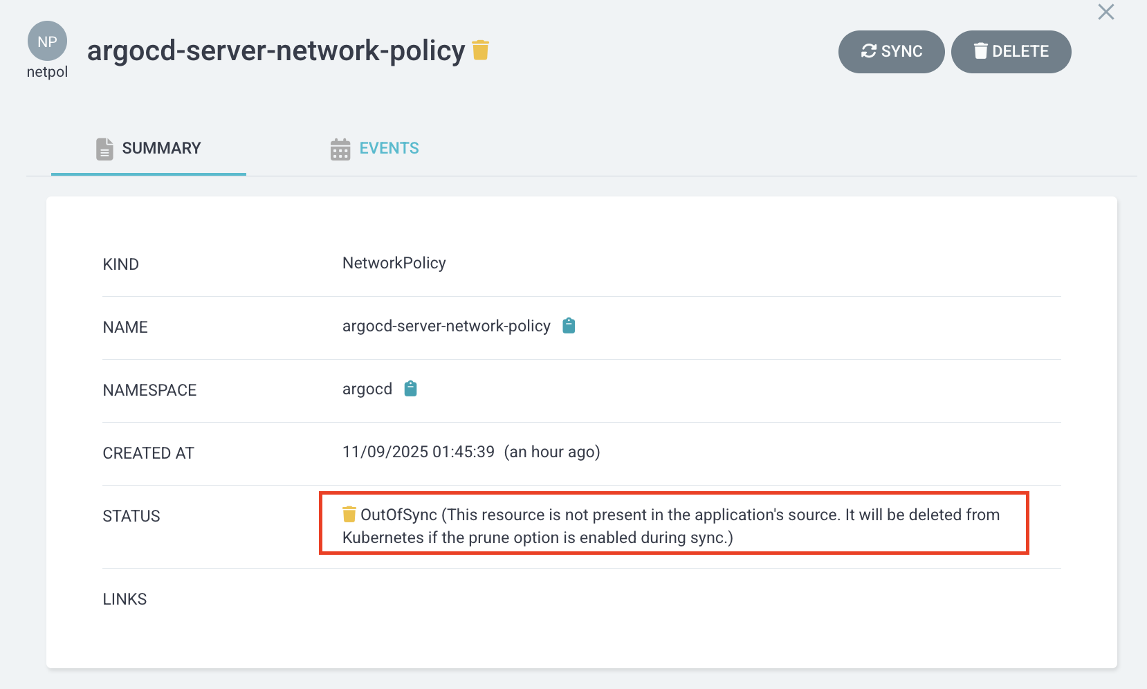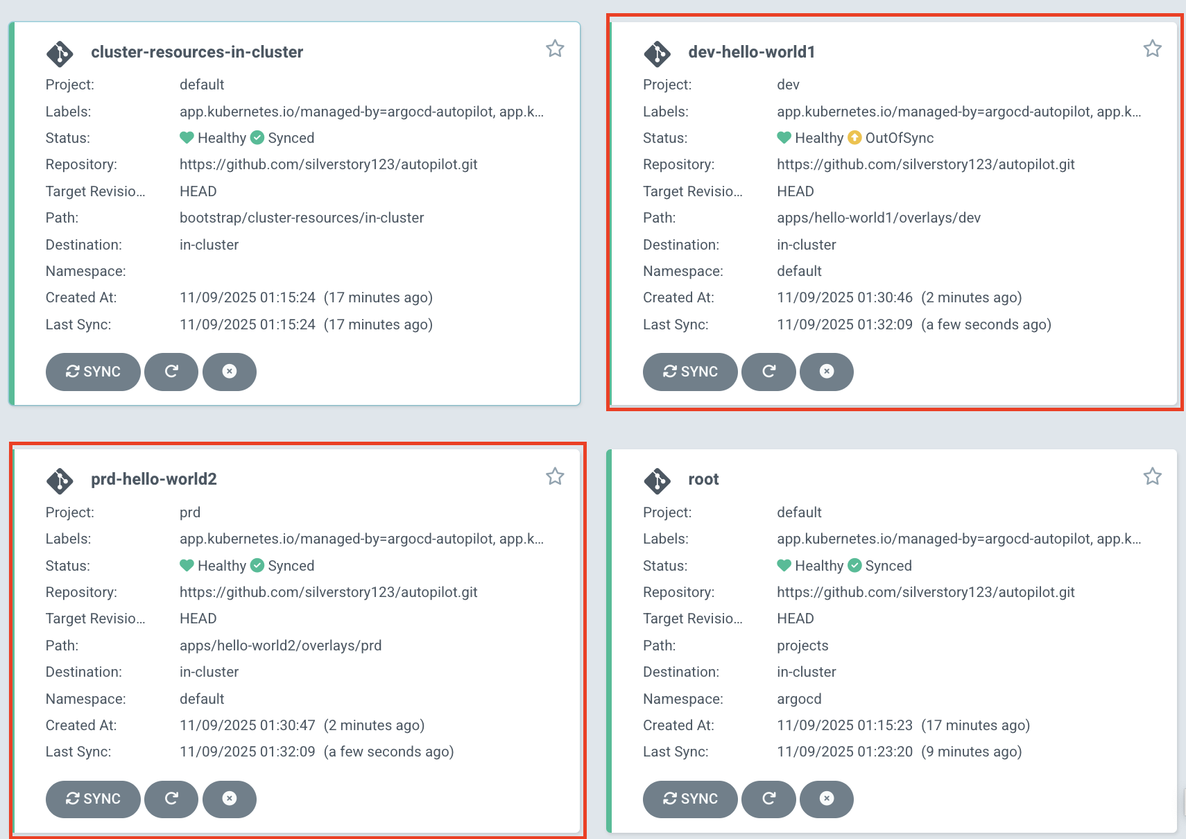 - 상태 감지 : Git저장소와 클러스터 간 차이가 발생하는 경우 OutOfSync 상태로 식별