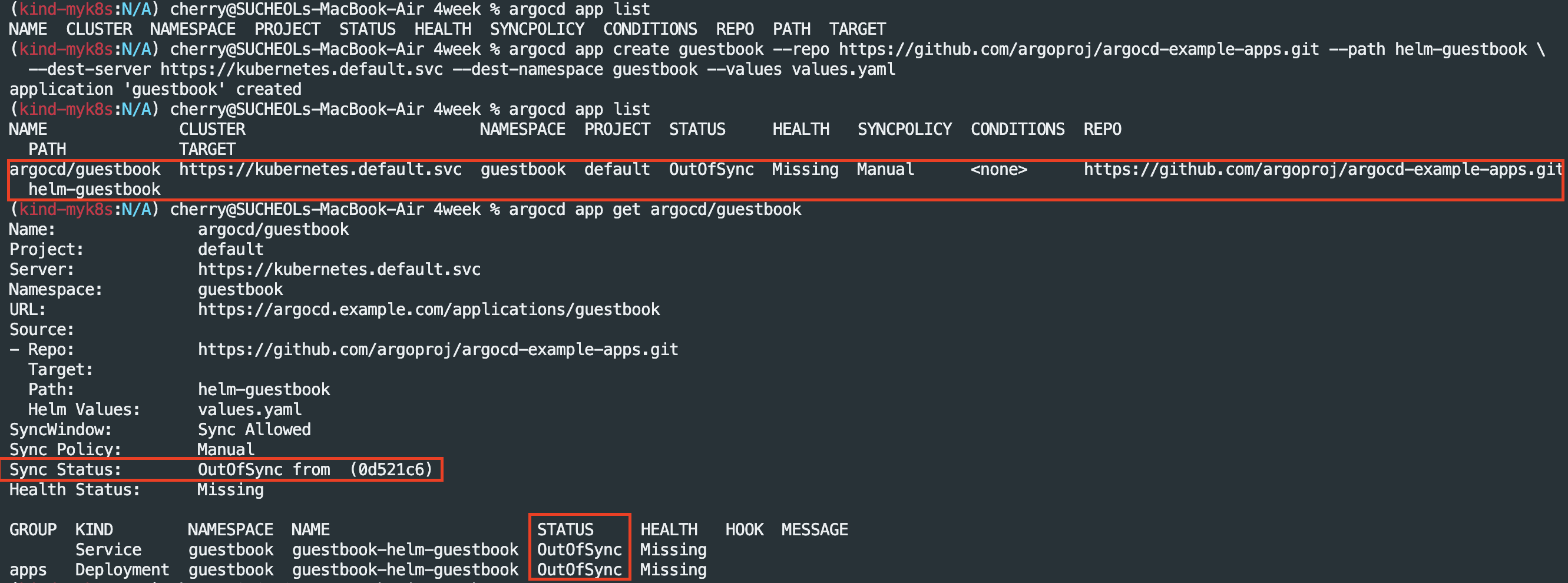 비교 결과, 두 상태가 다르면 Argo CD는 해당 애플리케이션을 OutOfSync (동기화되지 않음) 상태로 표시합니다.
