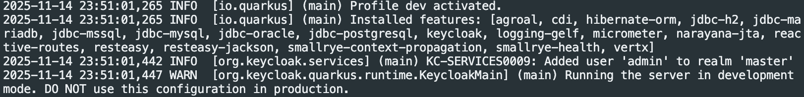 2025-10-13 13:52:36,943 WARN [org.keycloak.quarkus.runtime.KeycloakMain] (main) Running the server in **development mode**. DO NOT use this configuration in production.