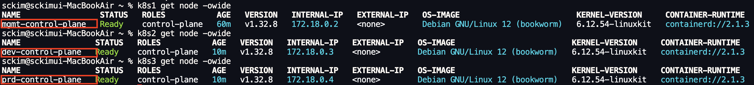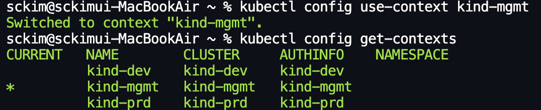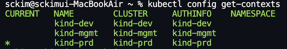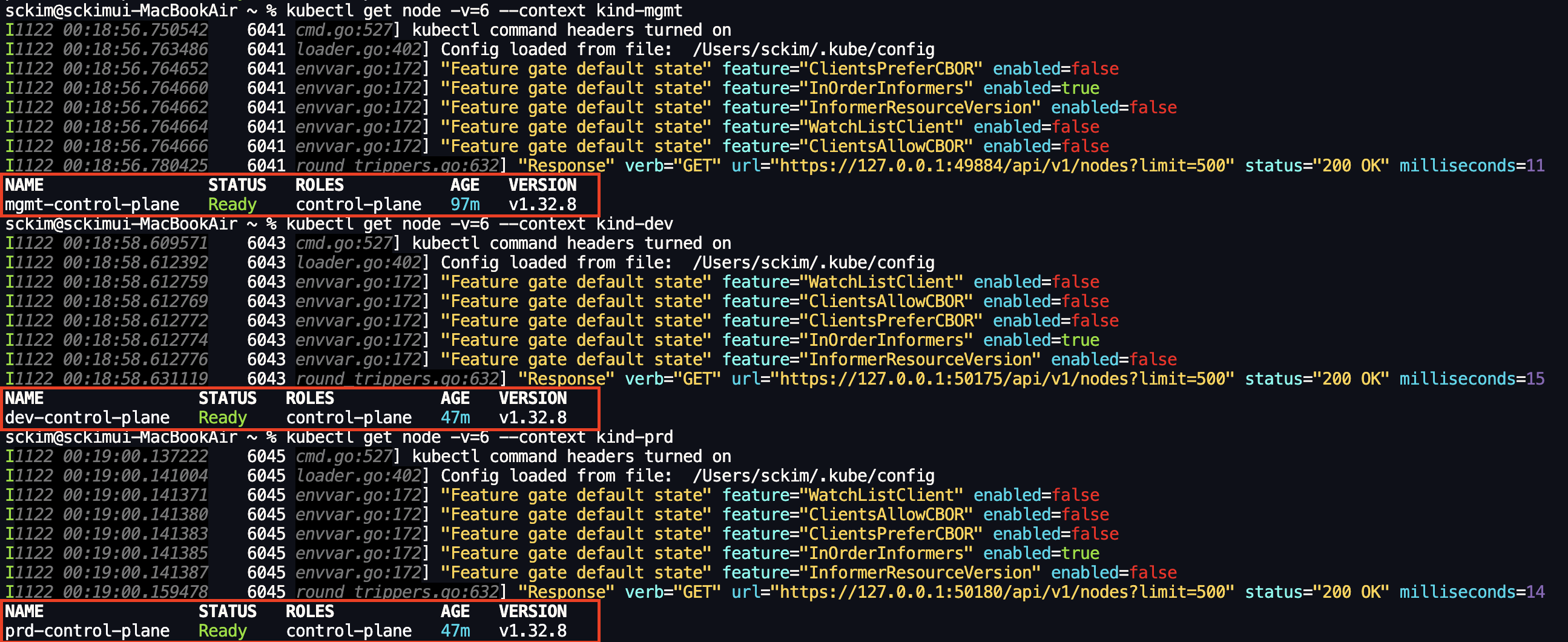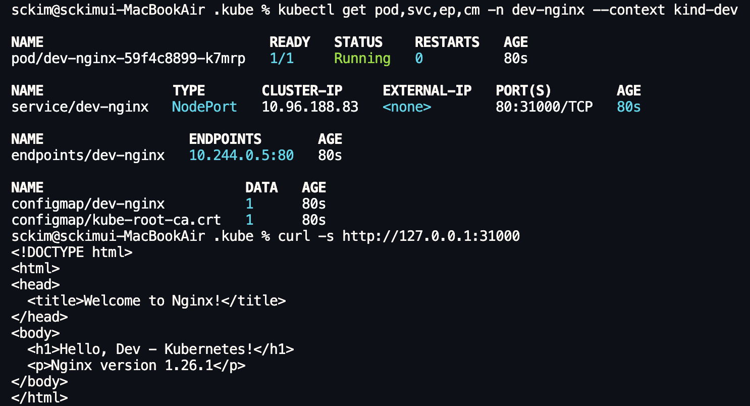 - 실제 Kubernetes 리소스를 클러스터(kind-dev, kind-prd)에 배포하고 관리