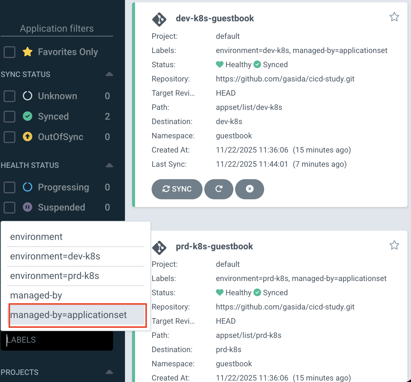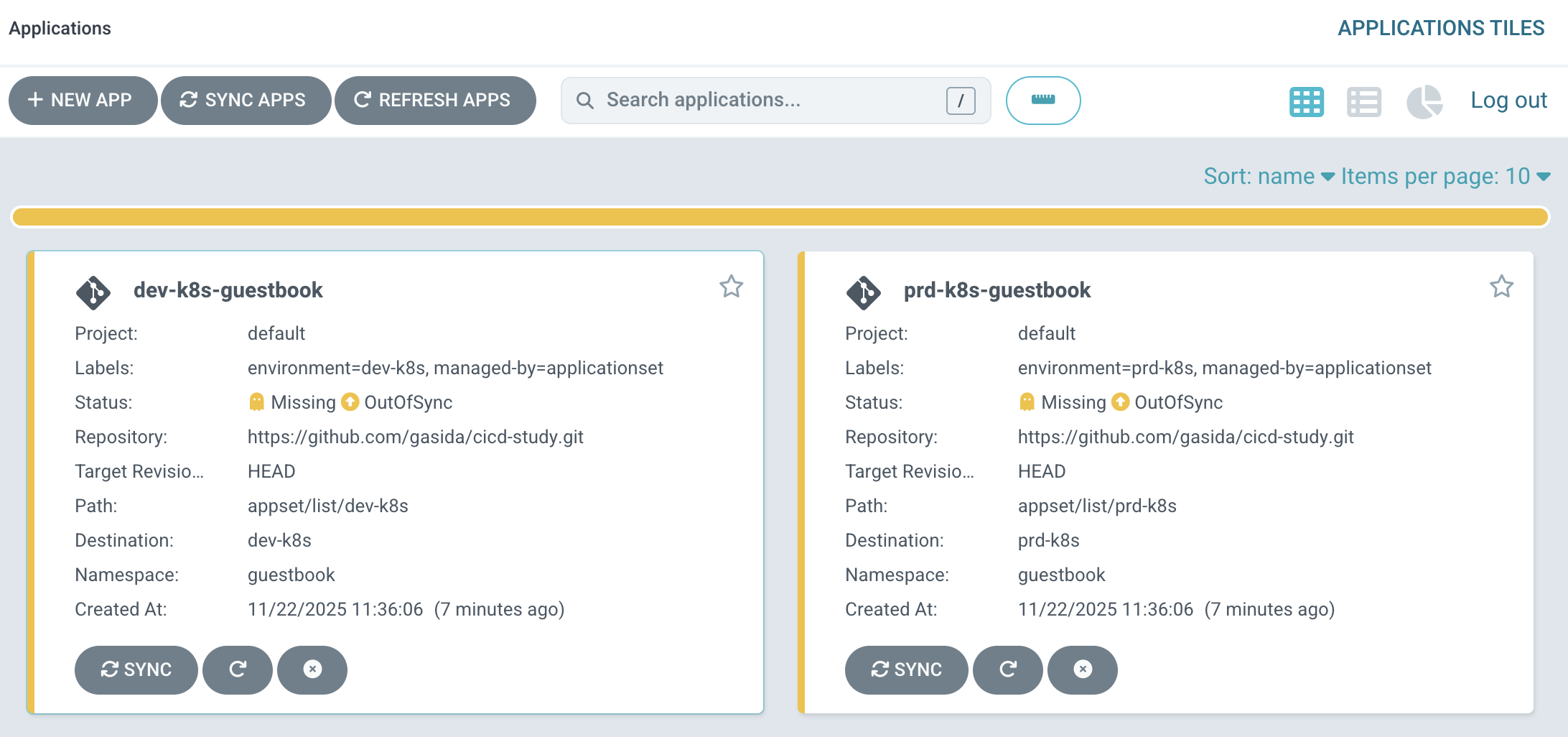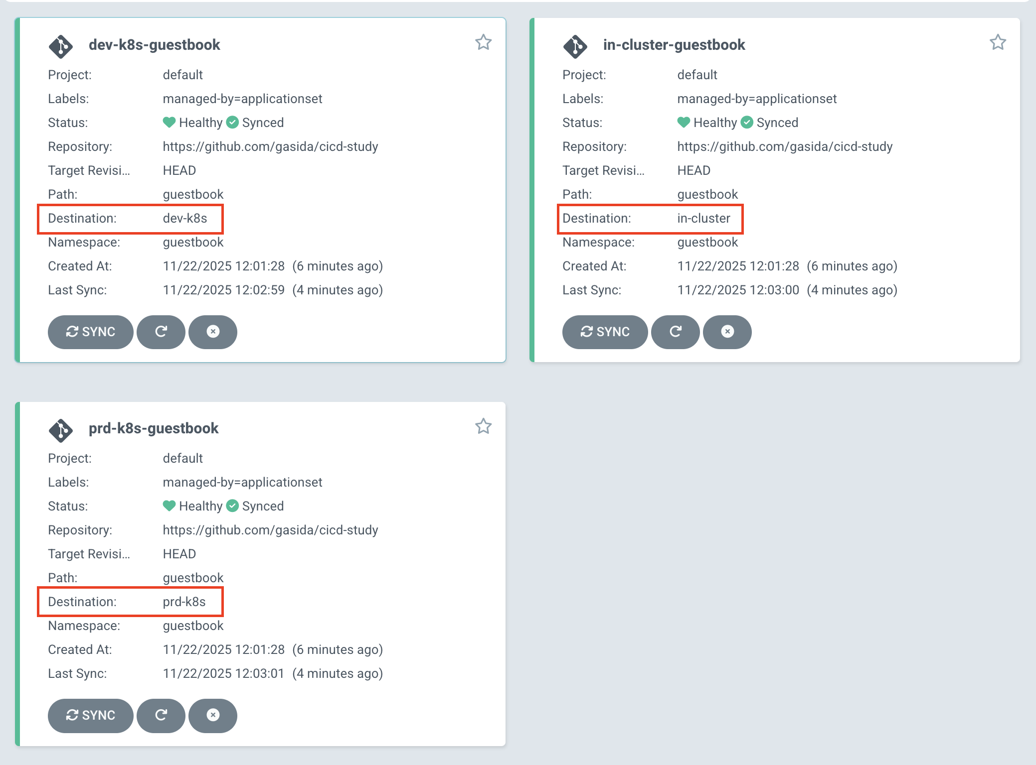 ArgoCD(In-Cluster) > ApplicationSet > Child Application > 하위 클러스터(Dev, Prd) 실행
