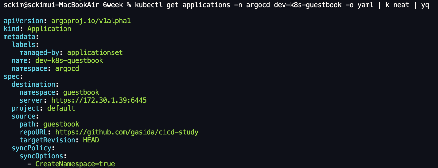 kubectl get applications -n argocd dev-k8s-guestbook -o yaml | k neat | yq