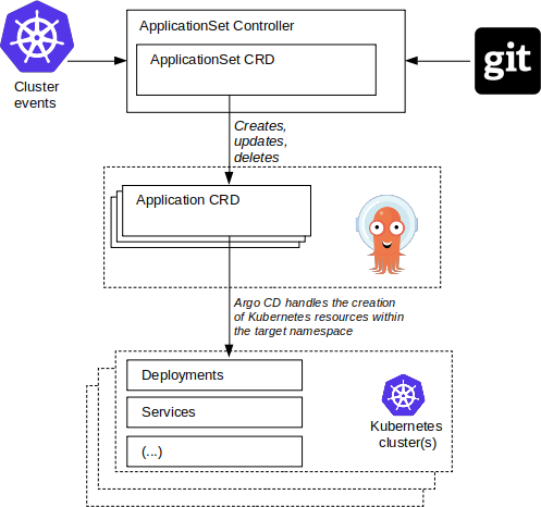 1. 해당 그림처럼 ApplicationSet Controller는 ArgoCD와 통신하는 목적은 애플리케이션에 생성,수정,삭제를 통해 선언적 상태를 정의된 상태로 보장 하는 것이 유일한 목표이다.