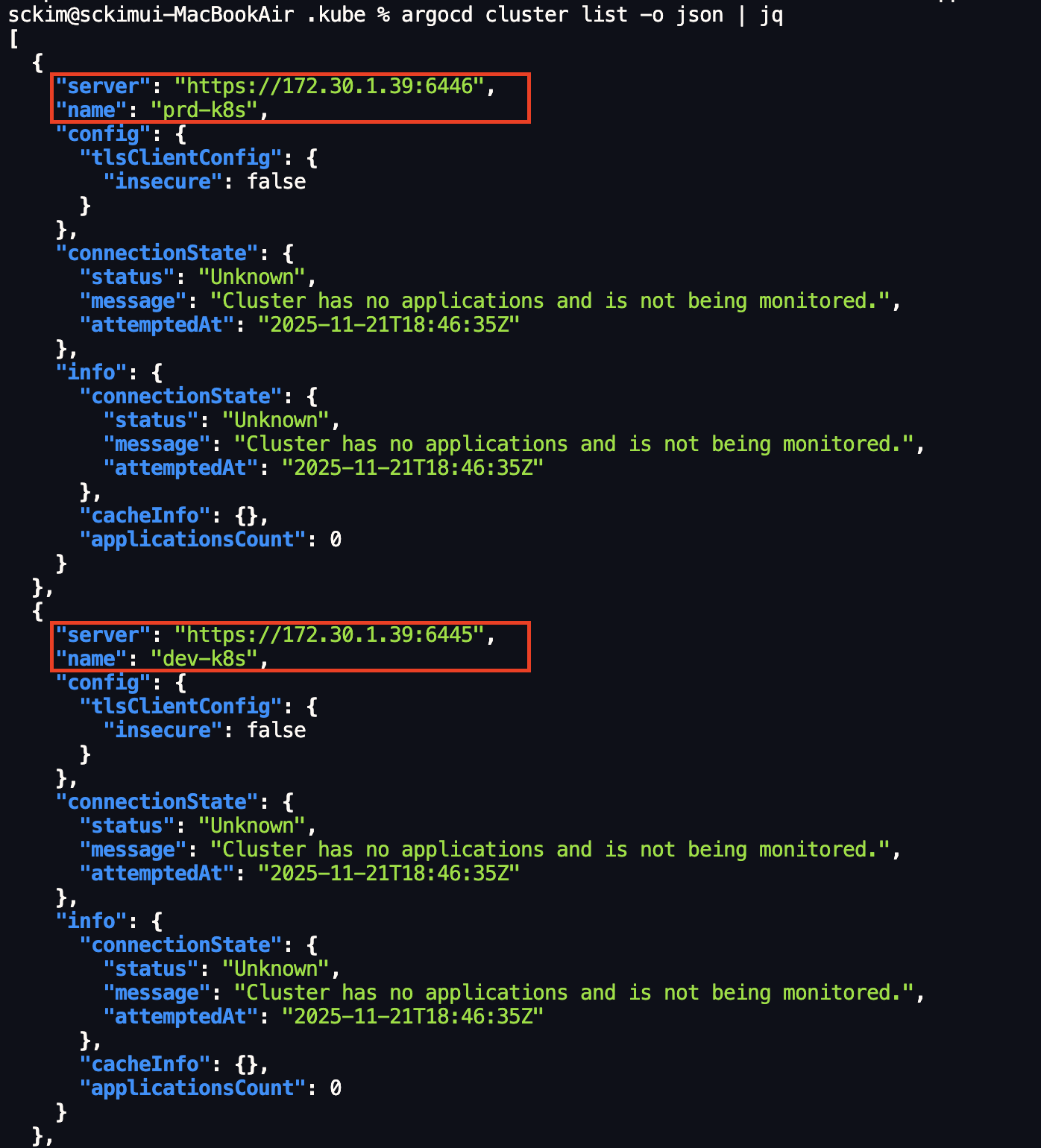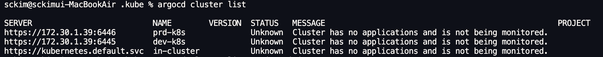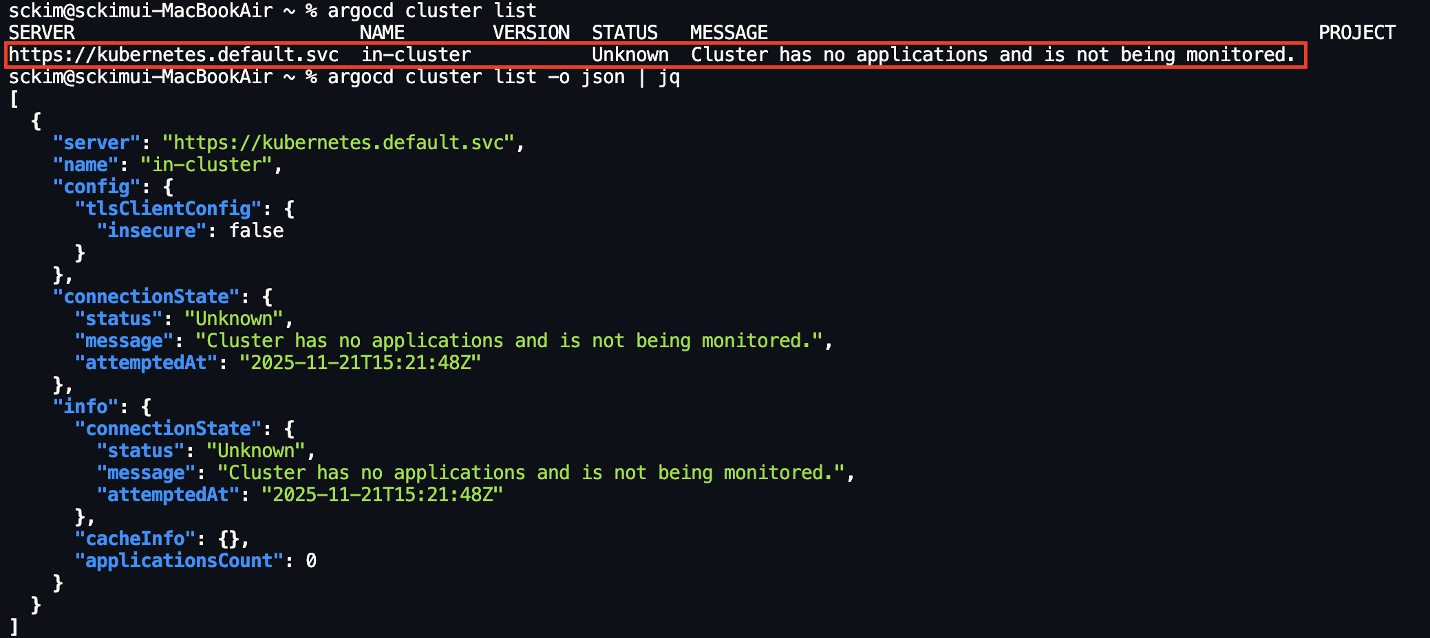 | List | Argo CD 애플리케이션이 사용할 수 있는 쿠버네티스 클러스터 목록 |