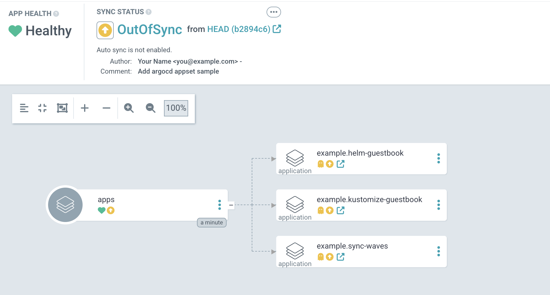 - Root App에서 생성된 애플리케이션은 실제 워크로드를 정의하는 Helm 차트, Kustomize 구성, Kubernetes Manifest 파일이 있는 각각의 Git 저장소를 특정 경로로 참조