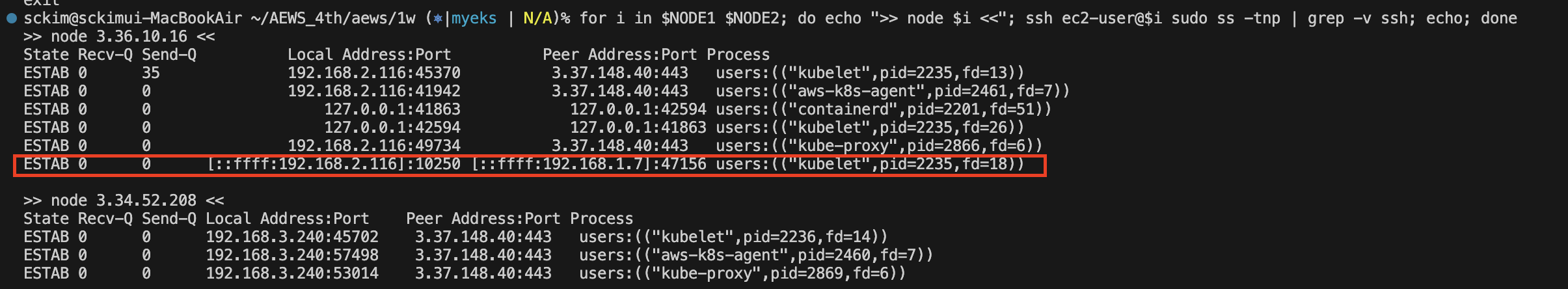 for i in $NODE1 $NODE2; do echo ">> node $i <<"; ssh ec2-user@$i sudo ss -tnp | grep -v ssh; echo; done