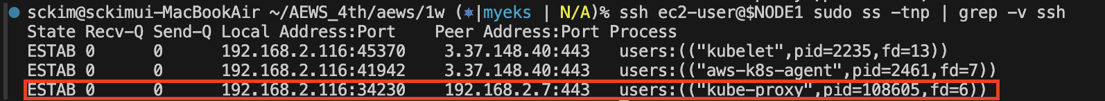 이때 Public Endpoint IP가 DNS를 통해 조회되어 내부 캐시로 사용될 확률이 높습니다. 그렇기에 kubelet, aws-node, kube-proxy를 재기동하여 소켓 연결이 변경되는지 확인해 보았습니다.